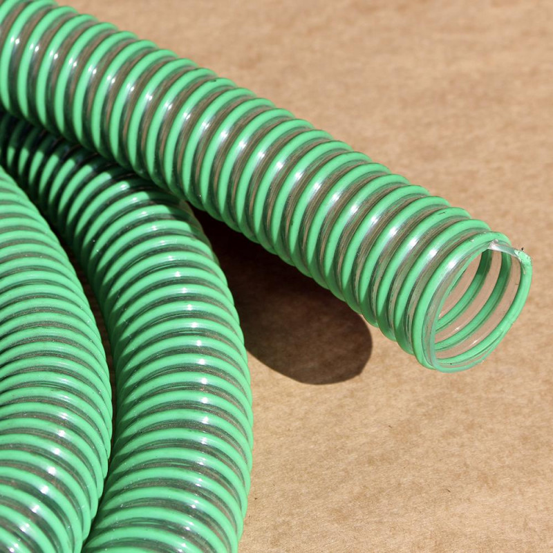 Mangueira Kanaflex KE transparente com espiral verde ou azul é indicada para serviços leves de sucção e descarga, para os setores de irrigação agrícola e construção civil.
