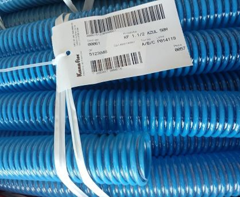 A mangueira Kanaflex flexível KF é um item auto-fluturante usado em piscinas. Com coloração transparente e espiral azul, a KF é resistente a raios ultravioletas, além de permitir o acompanhamento dos elementos succionados por meio da transparência.