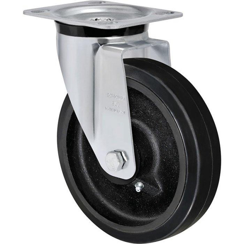 Os Rodízios Schioppa são Produzidas com revestimento de borracha moldada vulcanizada em núcleo de ferro fundido cinzento. Rodam com suavidade e baixo nível de ruídos, absorvem choques e vibrações. São resistentes a abrasão e produtos químicos. Podem ser utilizadas em velocidades de até 4km/h.